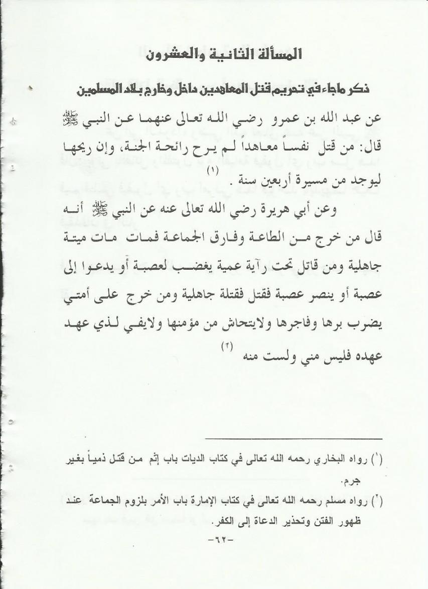 قال المؤلف عفا الله عنه المسألة الثانية و العشرون : ذكر ما جاء في تحريم قتل المعاهدين داخل وخارج بلاد المسلمين .