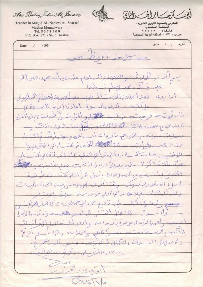 تقريظ فضيلة الشيخ أبي بكر بن جابر الجزائري حفظه الله تعالى على كتاب الرفق بالنسوة أعاذنا الله من القسوة